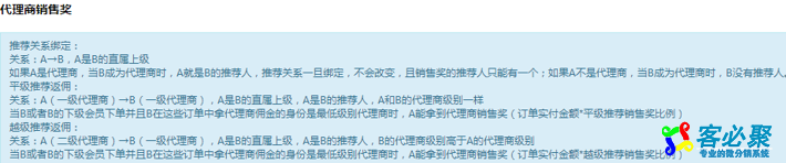 推荐关系绑定:如果他直属上级是代理商,他成为代理商时,推荐人是他直属上级,直属上级不是代理商,他成为代理商时,没有推荐人。推荐人只能有一个,就是他直属上级且必须为代理商,推荐关系一旦绑定,不会改变