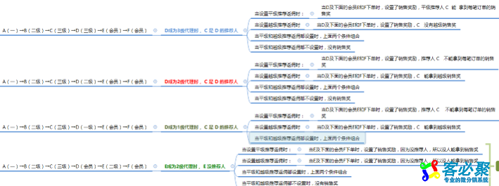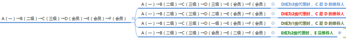 A(会员)→B(二级)→C(三级)→D(二级)→E(二级)→F(一级)→G(一级):以上代理商上下级都是推荐人关系;A下单,C拿代理商越级销售奖;若代理商越级销售奖未设置,A下单,则G拿一级代理商平级推荐销售奖。(由于B是二级代理商,所以只有一级代理商能拿平级销售奖)