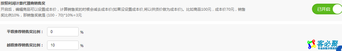 总部后台→会员→代理商→代理商管理:代理商销售奖增加“按照利润计算代理商销售奖”的开关,开启后,编辑商品可以设置成本价,计算销售奖的时候会减去成本价(如果没设置成本价,将以供货价做为成本价)。比如商品100元,成本价70元,销售奖比例10%,那销售奖就是 (100-70)*10%=3元。