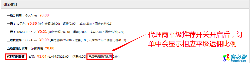 平级推荐返佣:我的代理商等级和我的推荐人的代理商等级一样当我或者我的下级会员下单并且我是他最低等级的代理商时,我的推荐人能拿到代理商销售奖(订单实付金额*平级推荐销售奖比例);