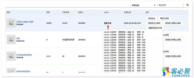 (3)门店后台商品新增查询字段:商品id 、skuid。Skuid下面的查看详情可以查看该商品的所有SKUid库存明细。