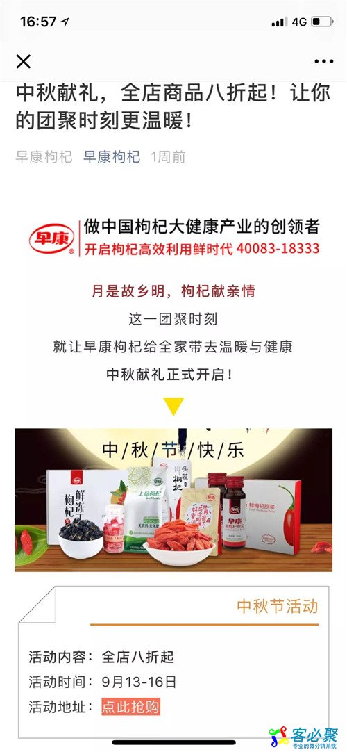 即将到来的中秋节营销是商家的营销必备,早康枸杞抓住用户的节日送礼需求,用打折这一简单粗暴的方式,激发客户购买。