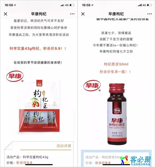 另外,早康枸杞会不定期选择几款特色商品作为秒杀商品,以9.9的低价与客户形成互动,维护好客户关系,赢得良好口碑。