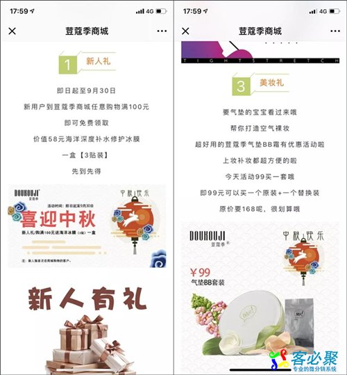 最近的中秋国庆相继来临,豆蔻季商城在明确自身的拉新、留存等需求的前提下,推出包括新人礼、回馈老客户、买赠活动等多项优惠活动,完成商城吸粉、老客户维护的目标。