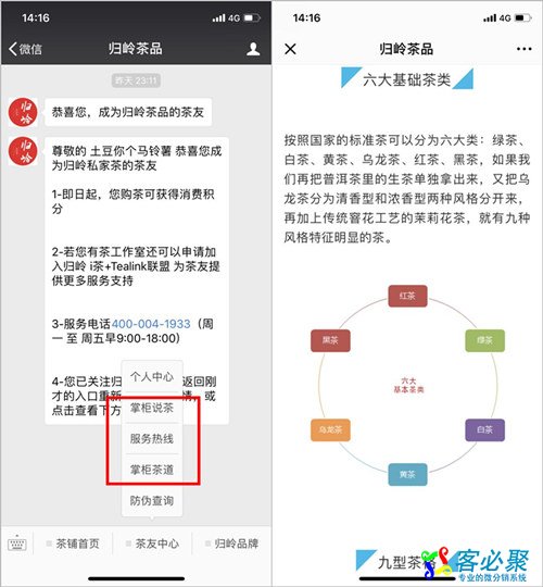“归岭茶品”微商城在与商城绑定的公众号内,开设“茶友中心”版块,“掌柜说茶”和“掌柜茶道”两块内容为用户科普茶文化知识,让用户在了解茶文化的基础上再自行决定是否购买。另外,商城提供服务热线,随时为消费者解答疑惑,一对一咨询效率更高。