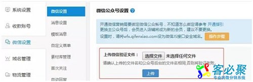 并将下载的该文件上传至华企网络科技微分销后台,设置—微信设置—微信公众号设置—上传文件,并在公众号后台进行确认。也就完成了华企网络科技微信商城与公众号的绑定工作。