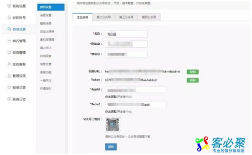 复制“回调URL”和“Token”,粘贴到公众号后台—开发—基本配置—服务器配置的相应栏目,提交后可获得相应的APPID和Secret,再将其复制到华企网络科技微分销后台的相应栏目即可完成华企网络科技微信商城与公众号的绑定。