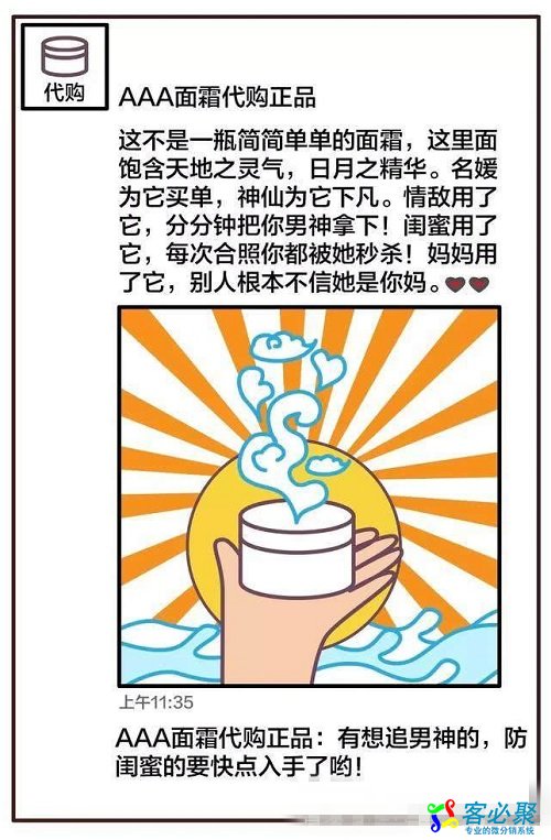 微商的文案往往并不华丽,充满画面感,用最简单直白的语言来影响用户的感受。大家常见的“声声震撼,激发梦想”、“创享极致,静心由我”这类华丽、空洞的文案在微商朋友圈里是不存在的。