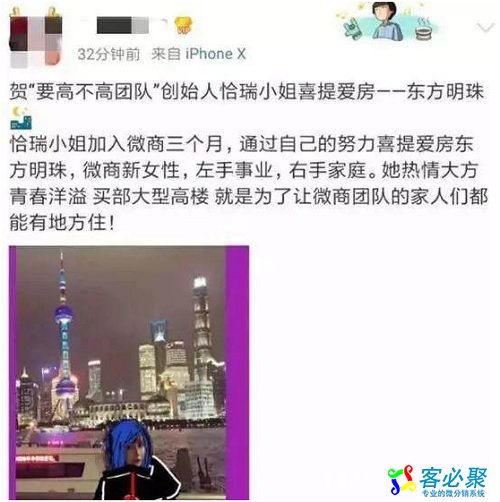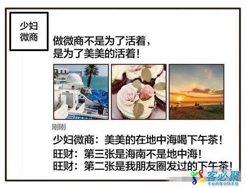 比如微商会分享自己去全世界各个地方旅游的照片,参加高档会议的照片,吃着精致茶点的侧面照,目的就是让用户相信他,并且购买产品。