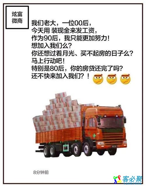 还有一种微商,类似于传销,本质上不再以商品买卖为目的,而是想纯粹通过发展下线牟取暴利。于是在他们的朋友圈里会看到一些花式炫富的内容。