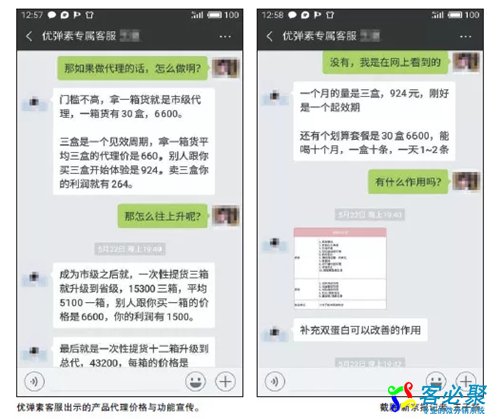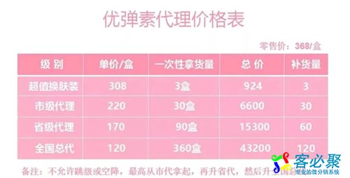 优弹素是只通过微商代理渠道来进行销售的。从一名代理处获得的内部资料表明,优弹素代理分四级,从低到高分别为体验代理、市级代理、省级代理、全国总代理。