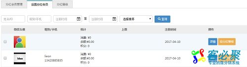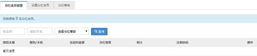 分红会员管理,可以根据姓名ID、昵称、手机或者选择分红等级进行查询会员人员;