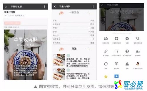 动态的场景秀类似于“易企秀”,是很容易传播且被受众接受的推广形式。图文秀也一样,通过图片+文字的形式展现,形成商家独有的风格进行分享导流。相对于纯文字的内容,更易于被受众接受。