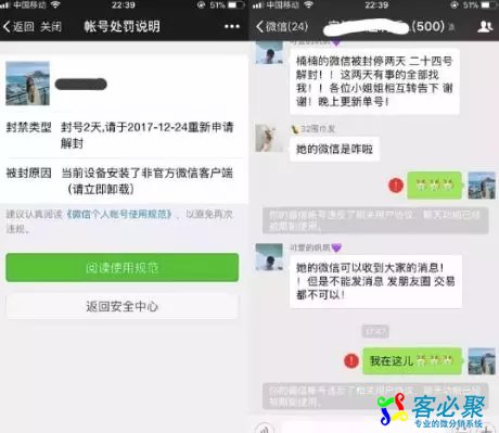 微信中心给出的封号理由是:该微信账号因使用非官方微信客户端被限制登录,若后续仍继续使用将永久封号处罚!