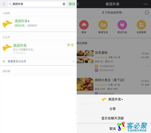 例如:饿了么、美团这类外卖APP的商家将店铺分享给微信好友或微信群时,会自动跳转至小程序,用户可直接进入小程序点餐