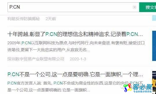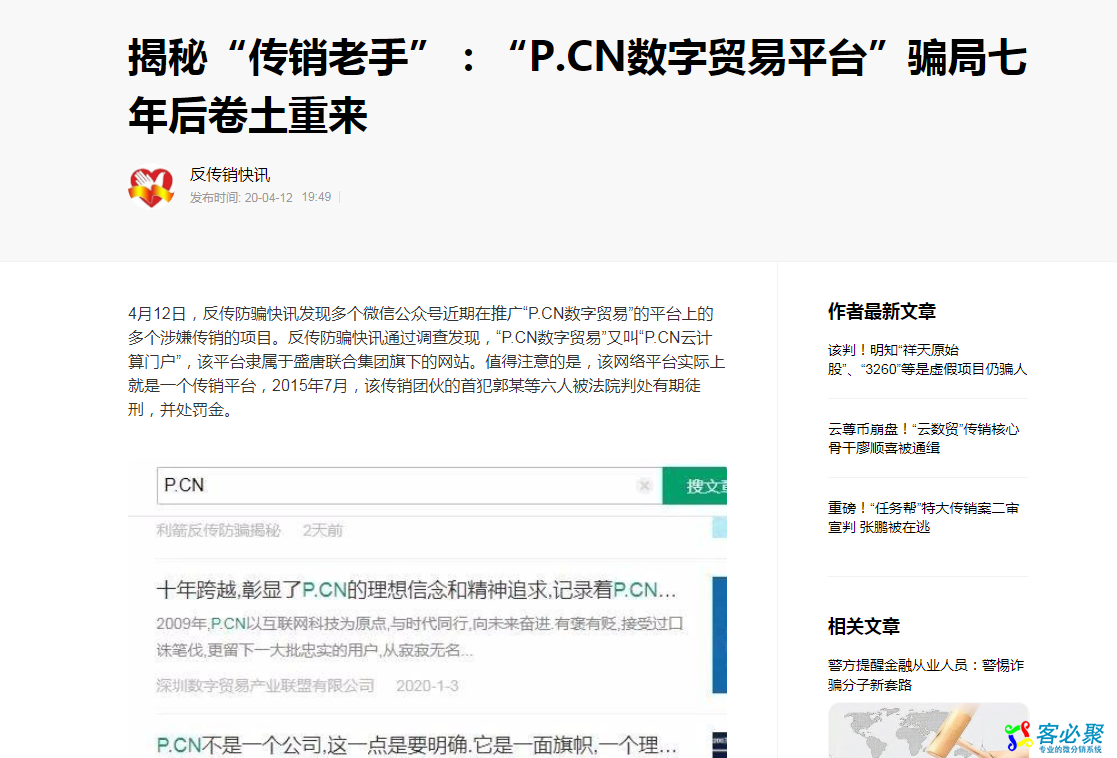 4月12日,反传防骗快讯发现多个微信公众号近期在推广“P.CN数字贸易”的平台上的多个涉嫌传销的项目。反传防骗快讯通过调查发现,“P.CN数字贸易”又叫“P.CN云计算门户”,该平台隶属于盛唐联合集团旗下的网站。值得注意的是,该网络平台实际上就是一个传销平台,2015年7月,该传销团伙的首犯郭某等六人被法院判处有期徒刑,并处罚金。
